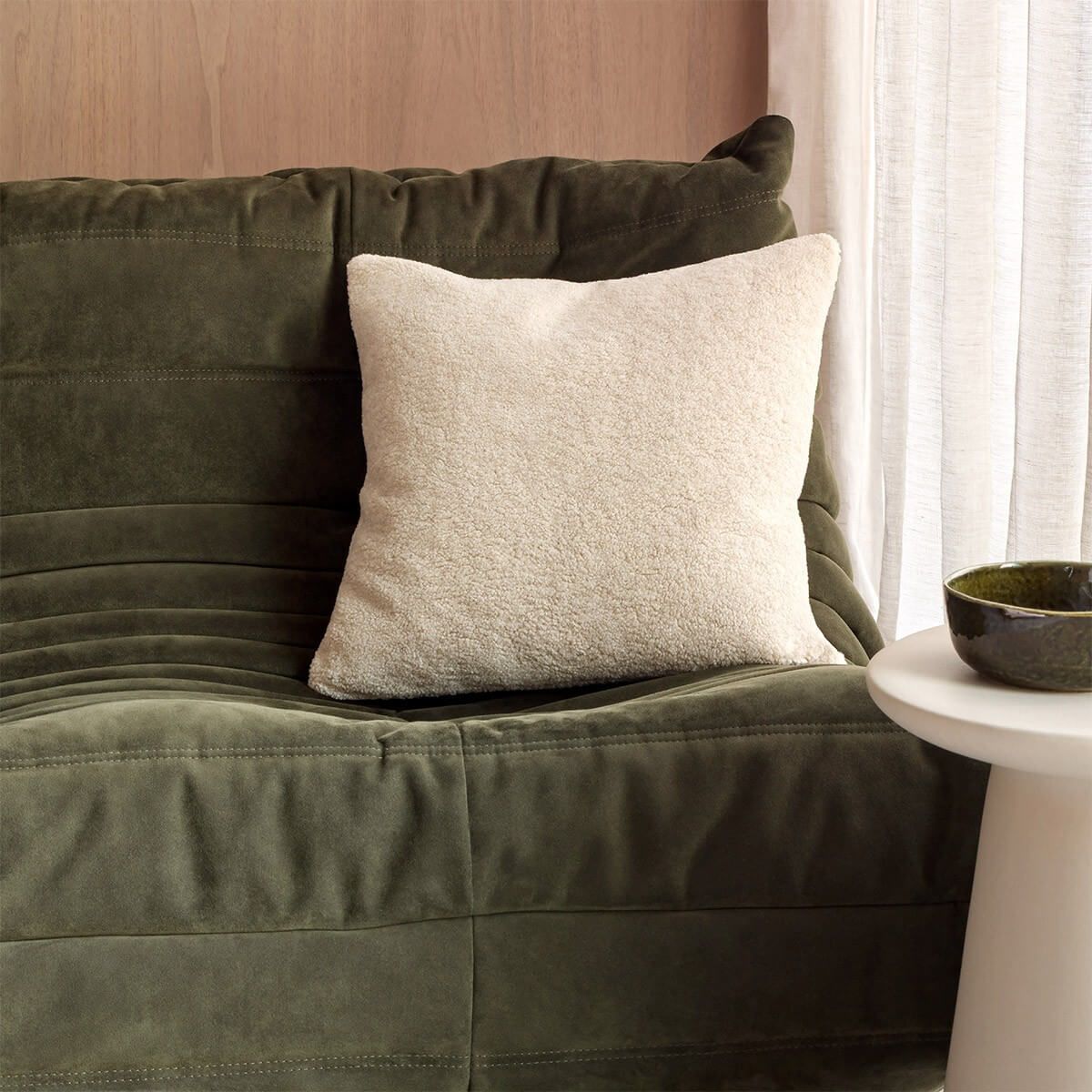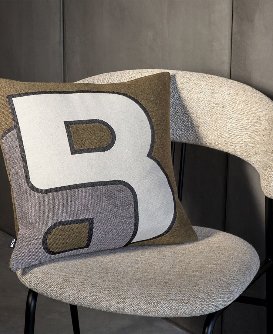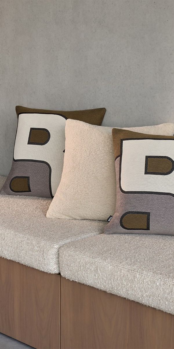 Coussin en drap de laine, surligné d’un passepoil anthracite contrasté.